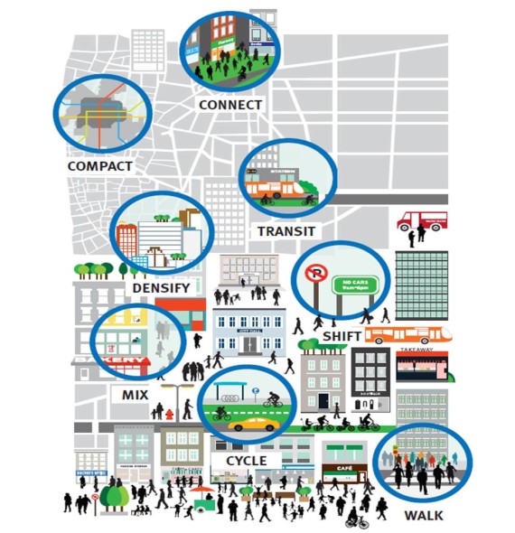 - გადაყვანა (განვითარების კონცენტრირება საზოგადოებრივი ტრანსპორტის ირგვლივ);